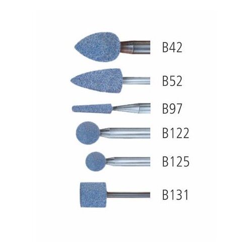 Mounted points in hardness J are manufactured from a vitrified bond and a grain mix of white aluminium oxide and blue ceramic. The soft bond in combination with the easy-tobreak-down, sharp-edged white aluminium oxide and the self-sharpening effect of the microcrystalline ceramic oxide grain allows extremely high stock removal rates with excellent