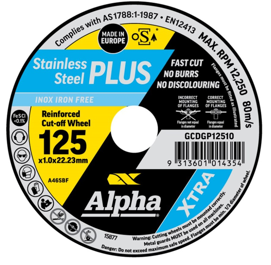 In StockALPHA STAINLESS STEEL PLUS is the most advanced stainless cutting disc in the market. New manufacturing technology has produced a disc with unparalleled performance and safety features that will maximise efficiencies and reduce costs in your stainless cutting jobs.