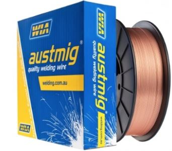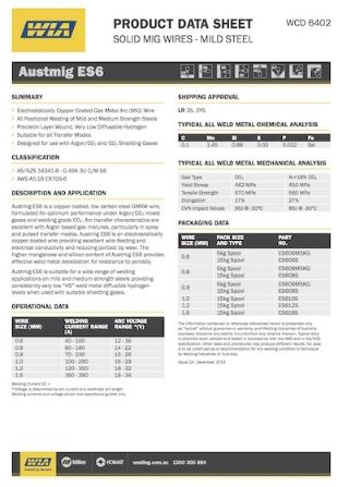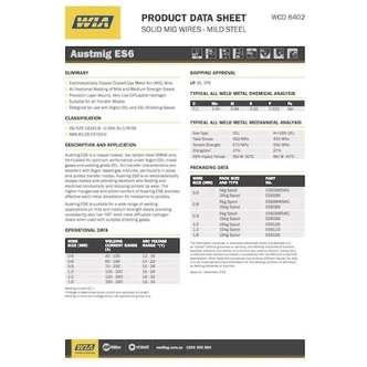 In StockAustmig ES6 - Copper coated, low carbon steel MIG wire specifically formulated for optimum performance under CO₂ and Ar/CO₂ mixed gases. Suitable for welding mild and medium strength steels. Ideal for positional welding of sheet steel and steel pipes and tubes where the high silicon content promotes smooth even weld beads with excellent edge wetting and contour.