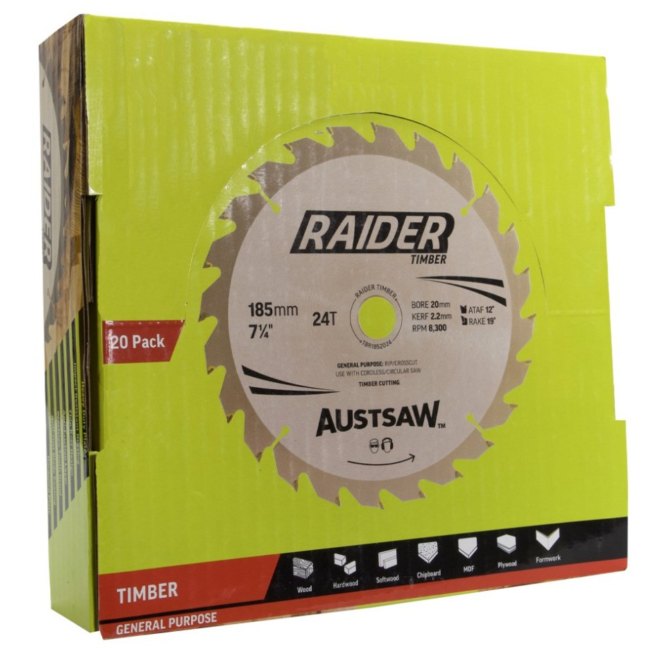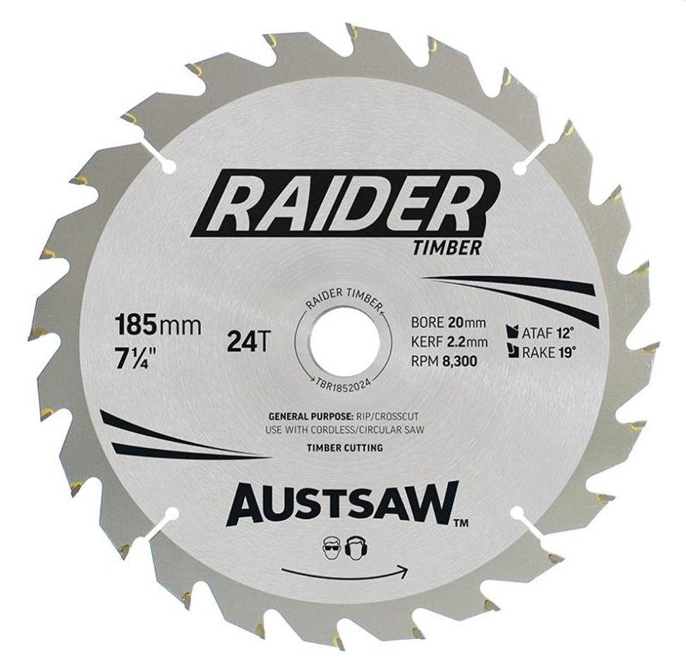 In StockAustsaw Raider timber blades are 185 mm (7-1/4?) diameter circular saw blades engineered for wood and general timber cutting applications.