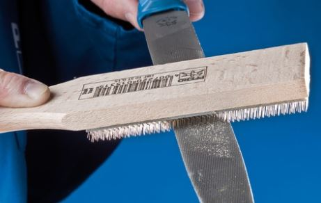 The file brush effortlessly cleans chips from a clogged file.