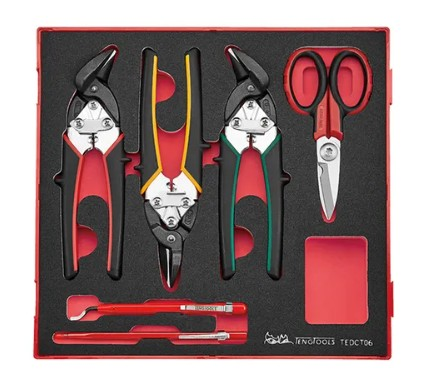 Designed for professional use within a variety of industrial applications, the TengTools 6-piece cutting tool set delivers solid performance and adaptability. Distinguishing this set is the TengTools compact tin snips, forged from chrome-molybdenum alloy steel. The tin snips come with serrated blades providing exceptional strength and precision, suitable for metalworking tasks such as cutting sheet metal and trimming ducts. Additionally, the set includes scissors with blades made from high-carbon stainless steel, a 150 mm scribing tool with a tungsten carbide tip, and a deburring tool with a rotatable HSS blade. It comes in a size 2 (FOAM2) tool module that securely organizes all tools, simplifying sorting and integration into your TengTools storage system.