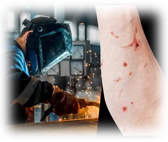 Burns are one of the most common injuries in welding. The temperature of a welding arc can reach 6000 degrees Celsius. The intense ultraviolet and infra-red rays can be harmful to both the welder and anyone else nearby. Burns occur frequently on hands and other exposed skin, but also in eyes from sparks and metal fragments. The symptoms of exposure to this level of heat are similar to extreme sunburn.